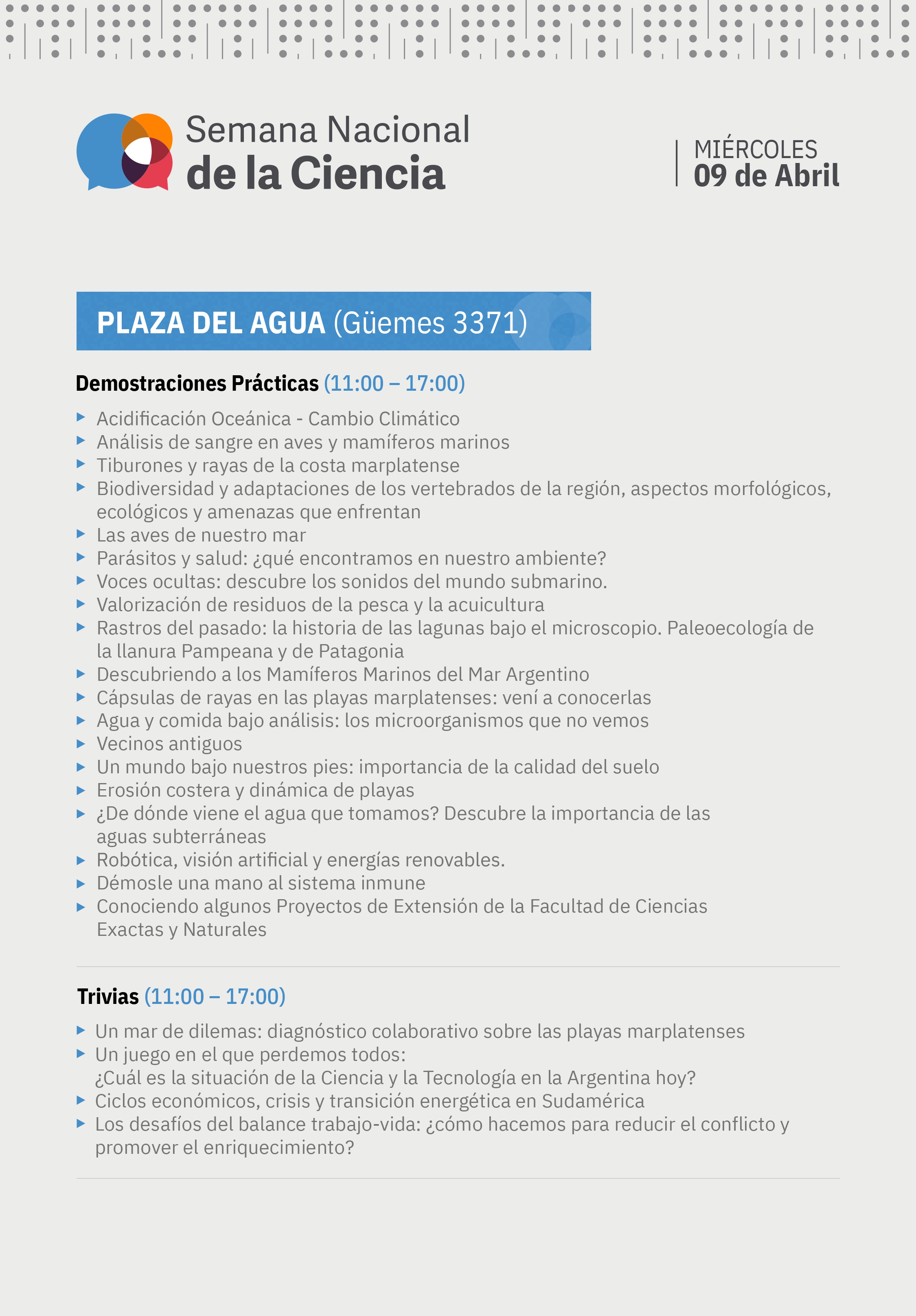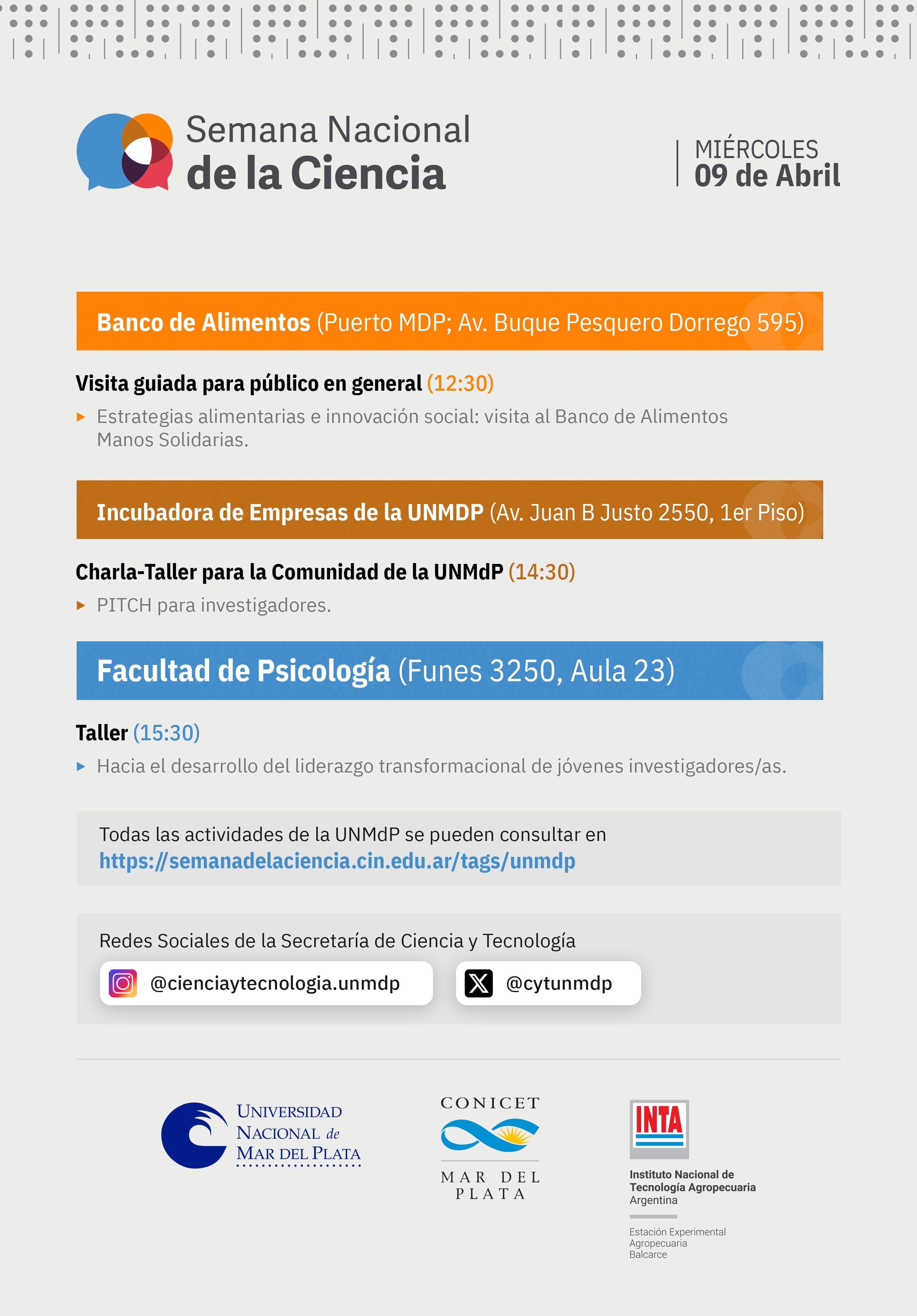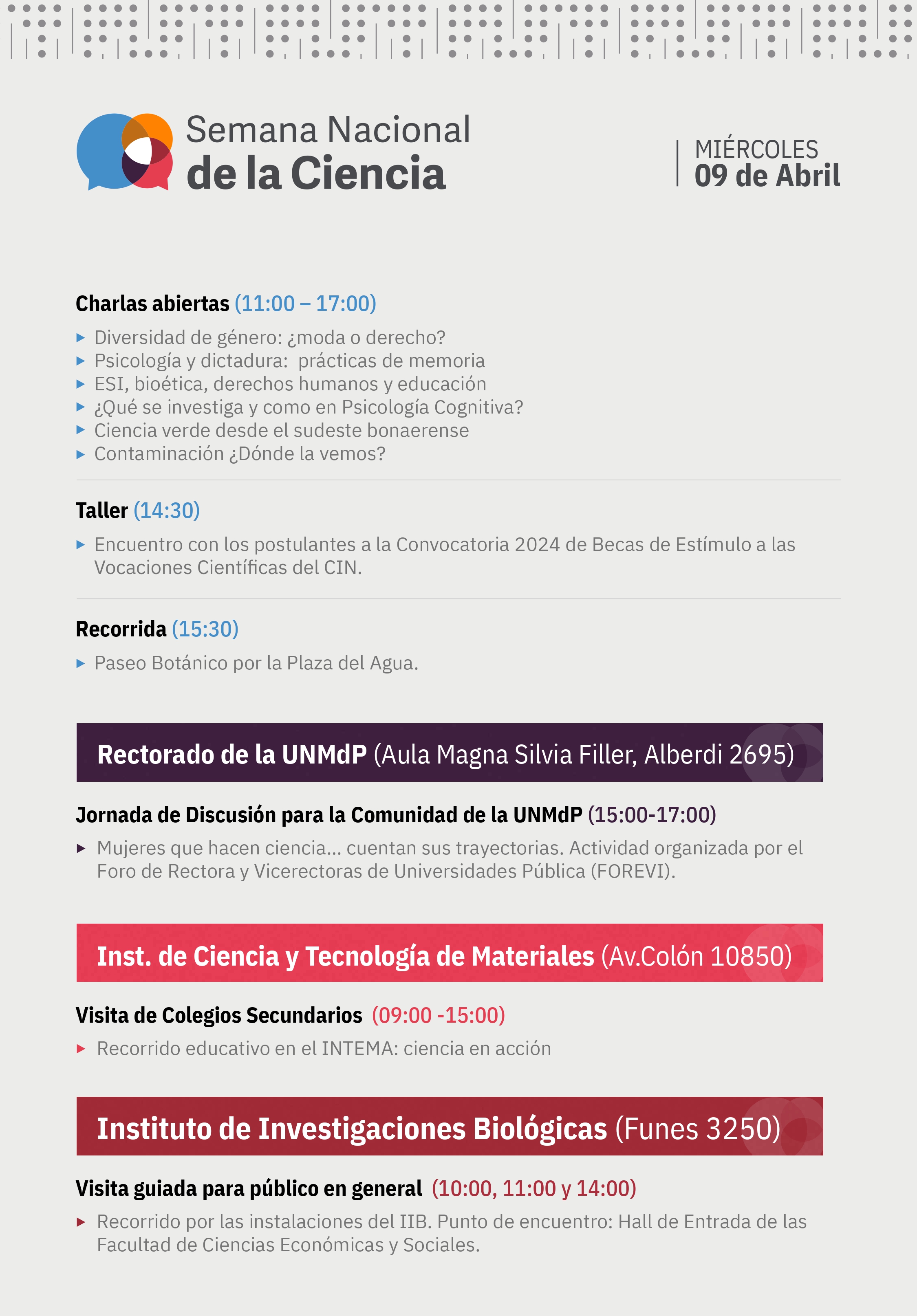 El martes 8 de abril comienza la Semana Nacional de la Ciencia para visibilizar desde todas las Universidades del país la profunda crisis que atraviesa el sistema científico de Argentina. Desde la UNMDP se realizarán más de 80 actividades, incluyendo numerosas charlas, demostraciones prácticas, trivias, visitas a institutos de investigación y varios eventos institucionales. Las actividades se desarrollarán a partir de mañana martes 8 en distintos ámbitos de la UNMdP, como así también en la Plaza del Agua, el Palacio Municipal de Balcarce, el Faro de la Memoria, el Puerto Mar del Plata y el Museo Municipal Lorenzo Scaglia, entre otros. La ESM estará presente en la Plaza del Agua el martes y miércoles. El viernes en la sede de Martilleros tendremos 4 charlas organizadas por los distintos grupos de investigación de la ESM. Les esperamos!